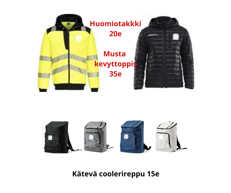 Nyt edullisesti laadukkaita Anuco Oy:n (entinen Temrex) takkeja ja coolerilaukkuja. Keltaisia ja oransseja paksusta collegesta valmistettuja huomiohuppareita 20 euroa/kpl ja mustia kevyttoppatakkeja 35 euroa/kpl. Coolerilaukut 15 euroa/kappale.